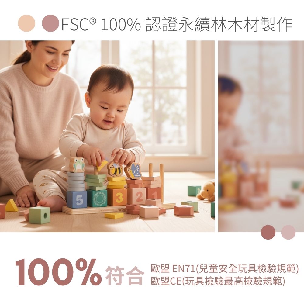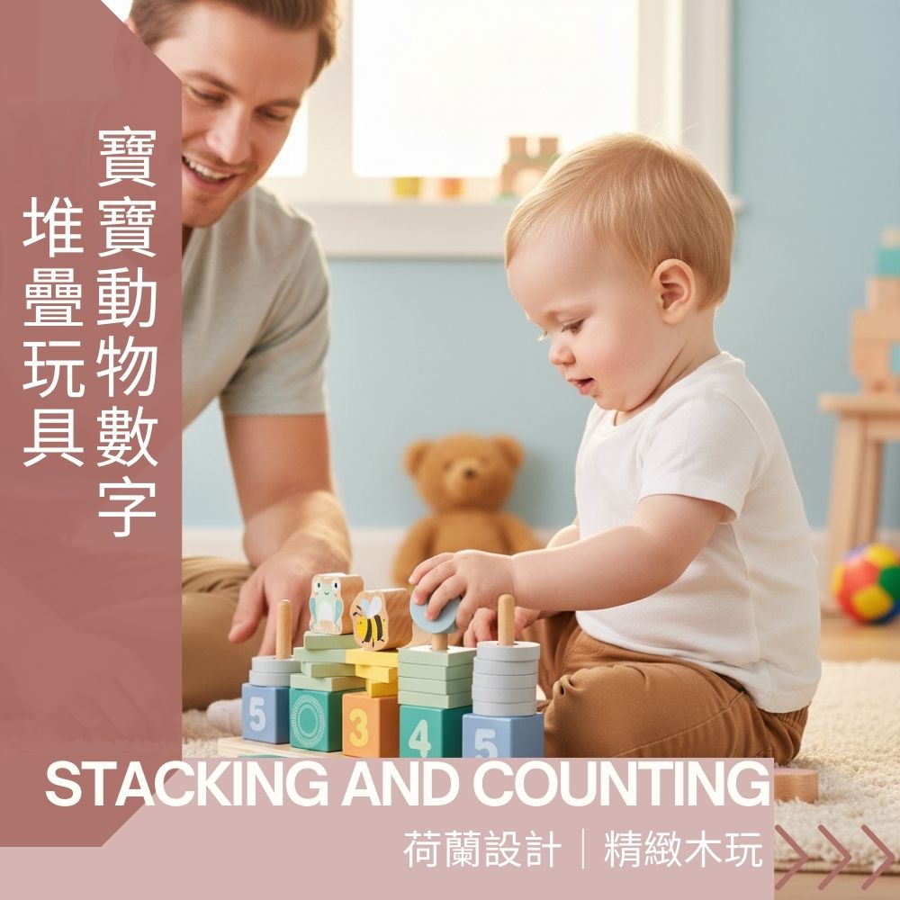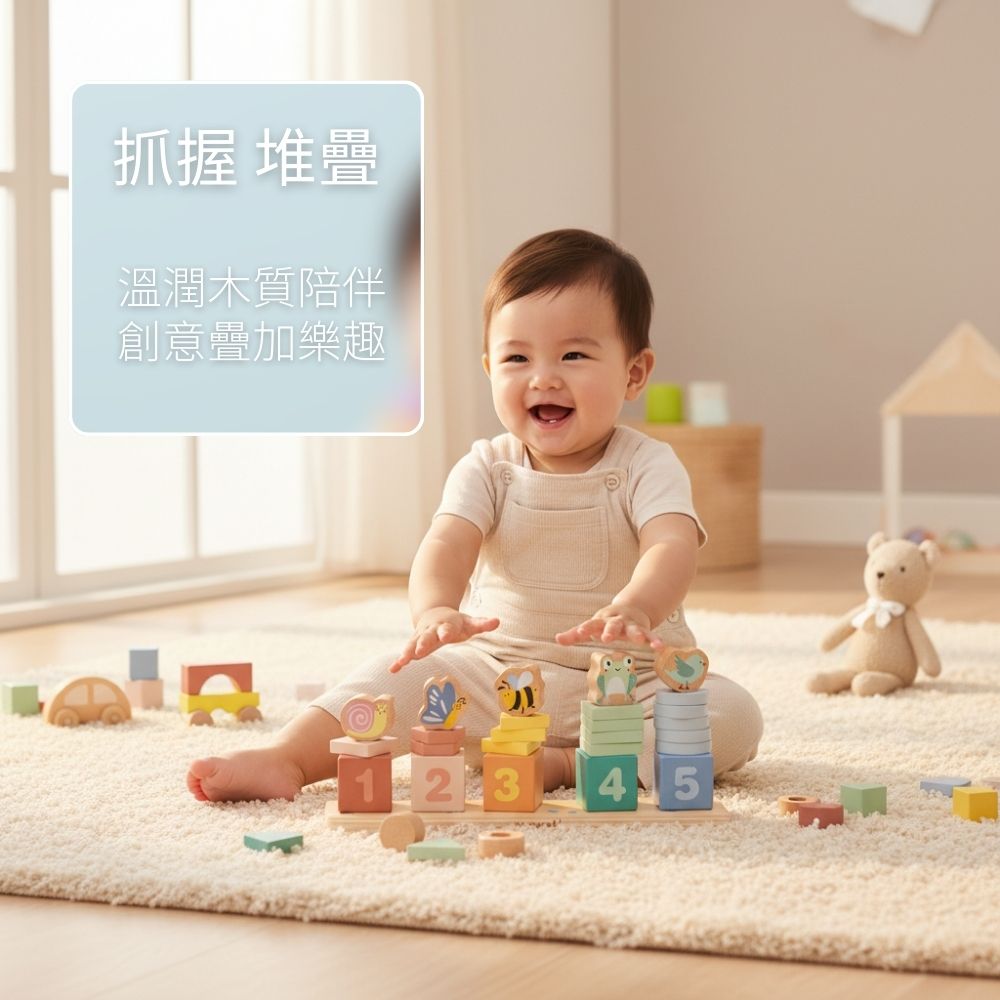 | 內容物 | 木製底座(含5根木樁) x1、數字積木(1-5) x5 形狀堆疊片 x15、動物積木(蝸牛/蝴蝶/蜜蜂/青蛙/小鳥) x5 |
