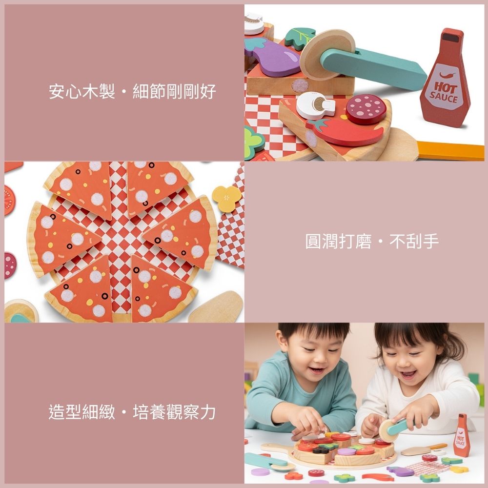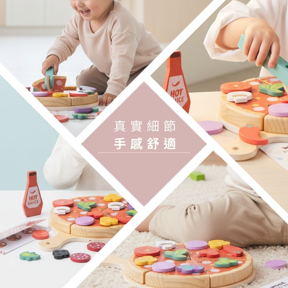 🍕 擬真切切樂趣:披薩片之間以魔鬼氈連接,使用木製滾刀切開時會發出清脆的「卡滋」聲,滿足手感與聽覺回饋。
