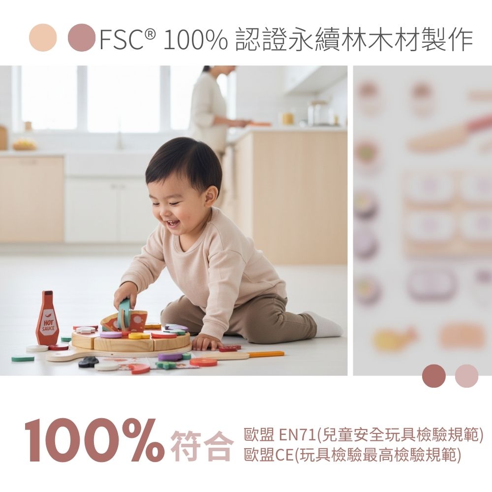 🌳 天然實木製作:採用 FSC® 100% 認證永續林木材與無毒水性漆,邊角圓潤,讓孩子安心享受烹飪樂趣。
