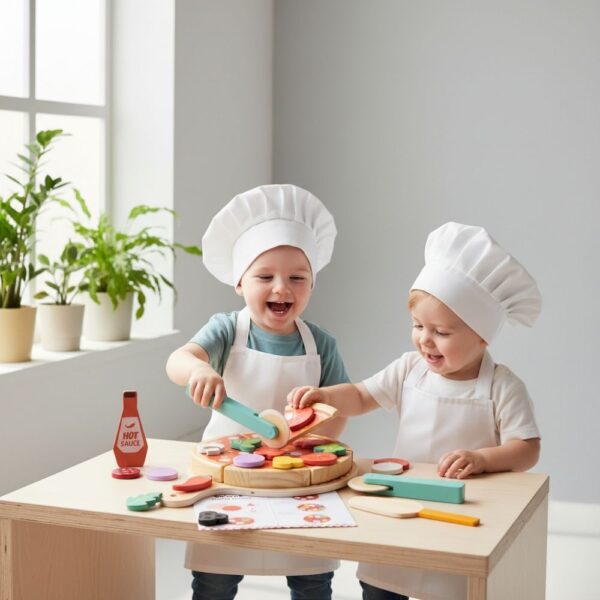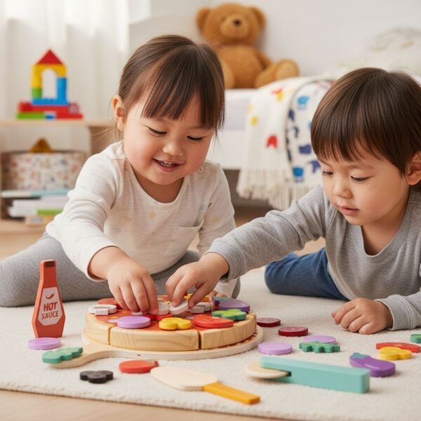 🍄 自由搭配配料:豐富的配料(臘腸、蘑菇、洋蔥等)可透過魔鬼氈自由黏貼,讓孩子發揮創意,打造獨家口味。