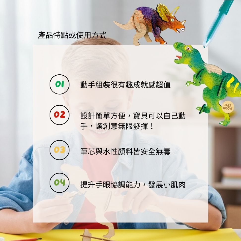 | 內容物 | 2片可組裝恐龍木板、5支噴筆、1個膠水、塑膠軟筆、貼紙 |