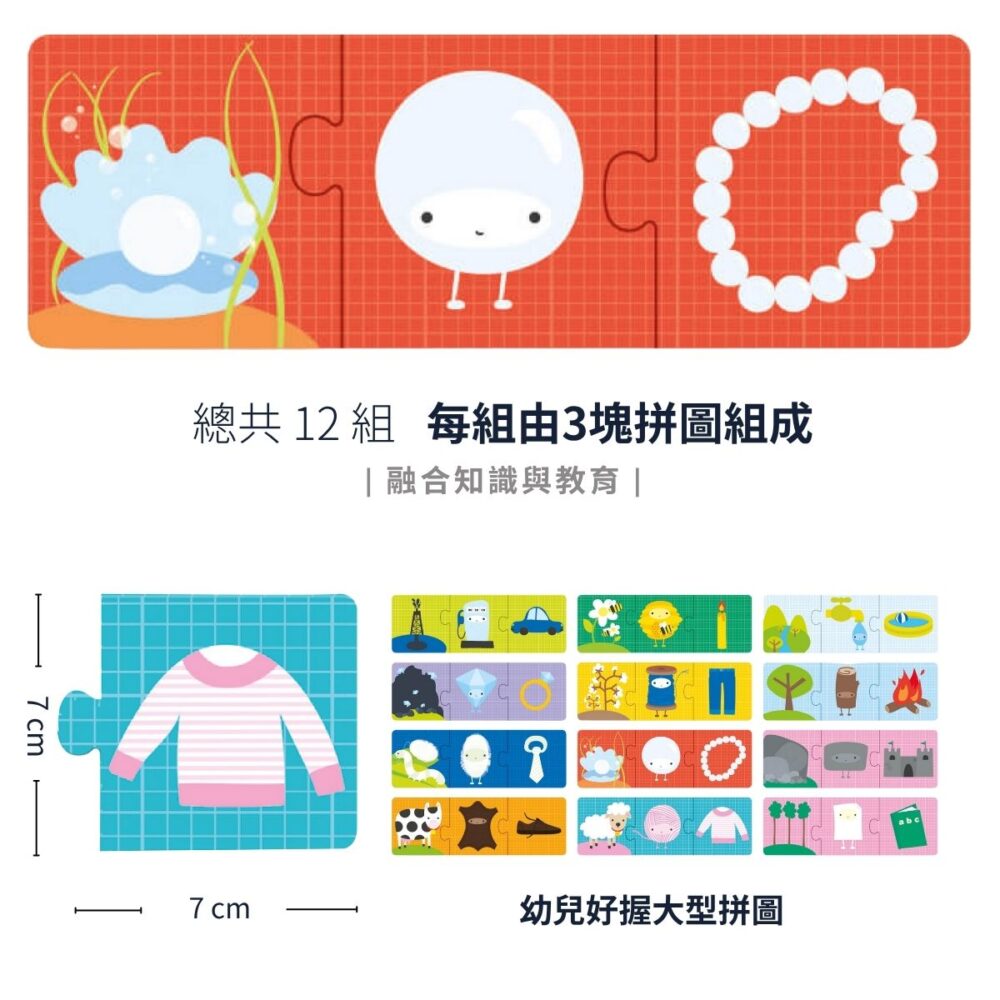 🧩 進階序列拼圖:共 36 片(7 × 7 cm),組成 12 組「3 連序」情境,小手一步步排出正確順序。