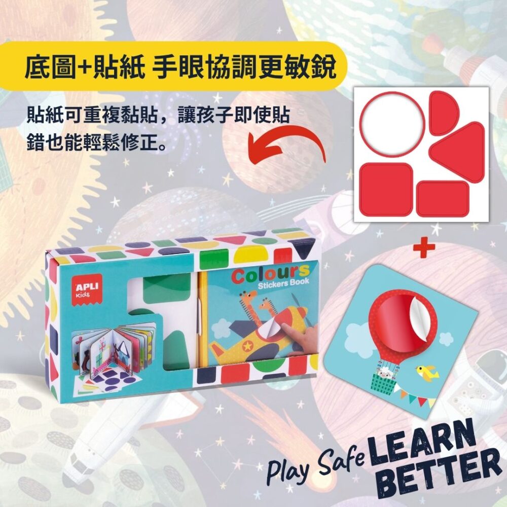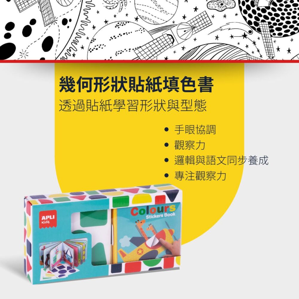 🎨 搭配 4 張可重複黏貼的彩色幾何貼紙,孩子能修正錯誤並完成圖案。