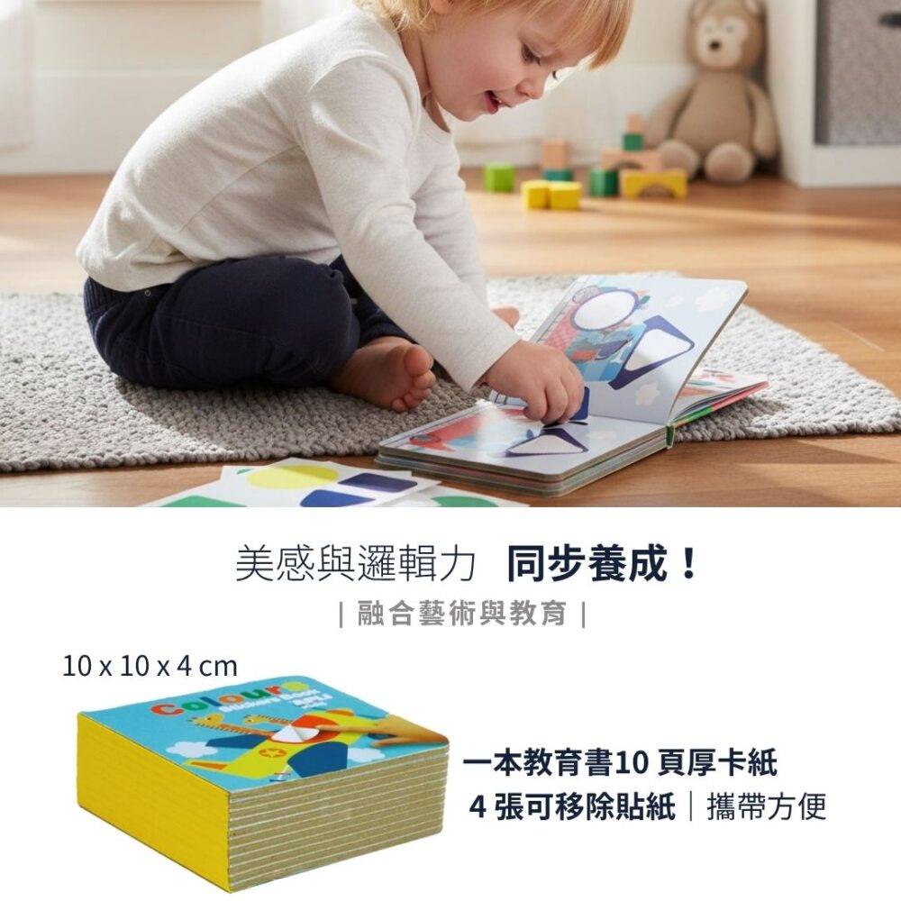 | 內容物 | 包含一本教育書(尺寸 100 x 100 x 40 毫米,10 頁厚卡紙,每頁 3 毫米厚)以及 4 張可移除貼紙。 |