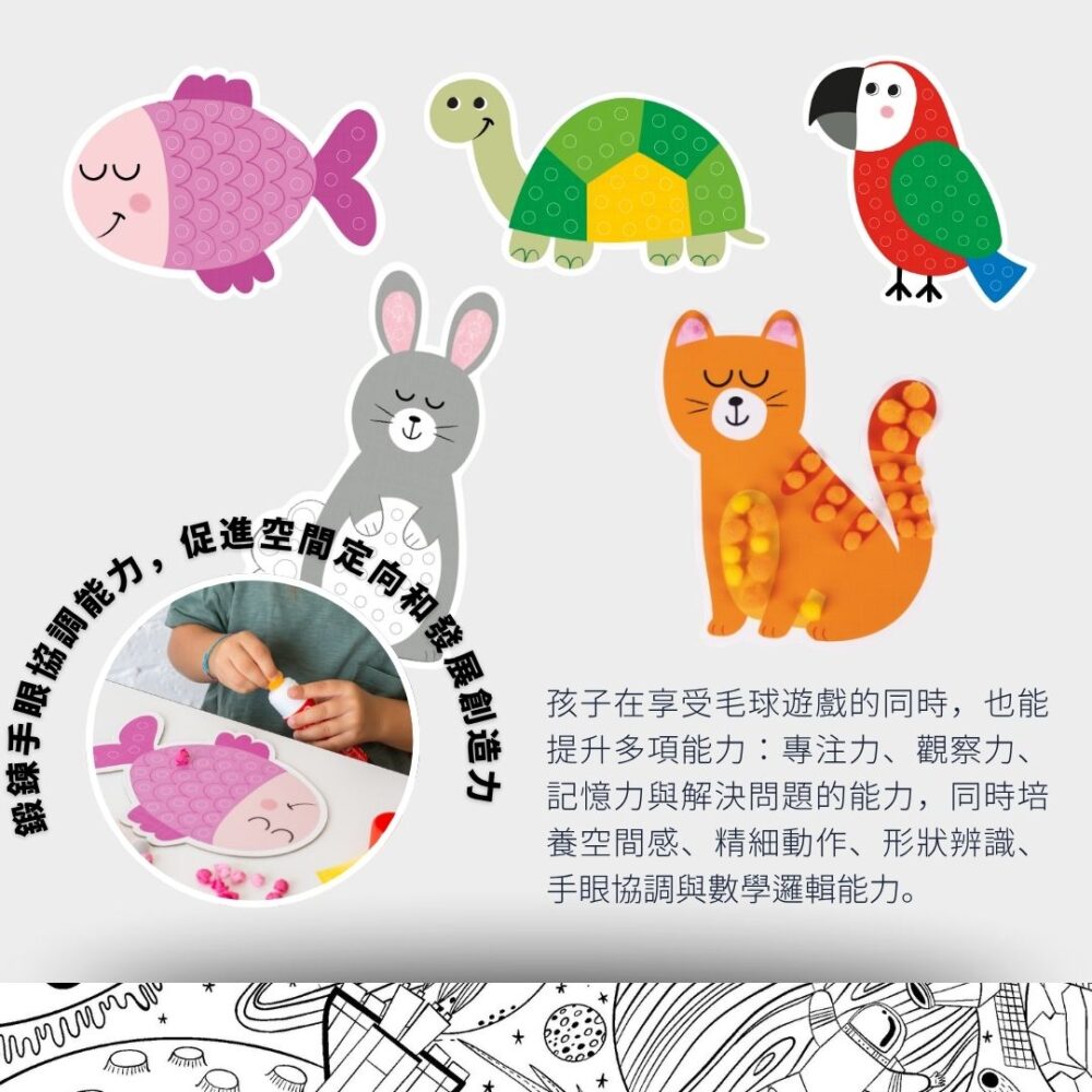 🐾 動物主題蓬蓬球手作:跟著圖樣把絨球黏在指定位置,打造可愛寵物立體造型。