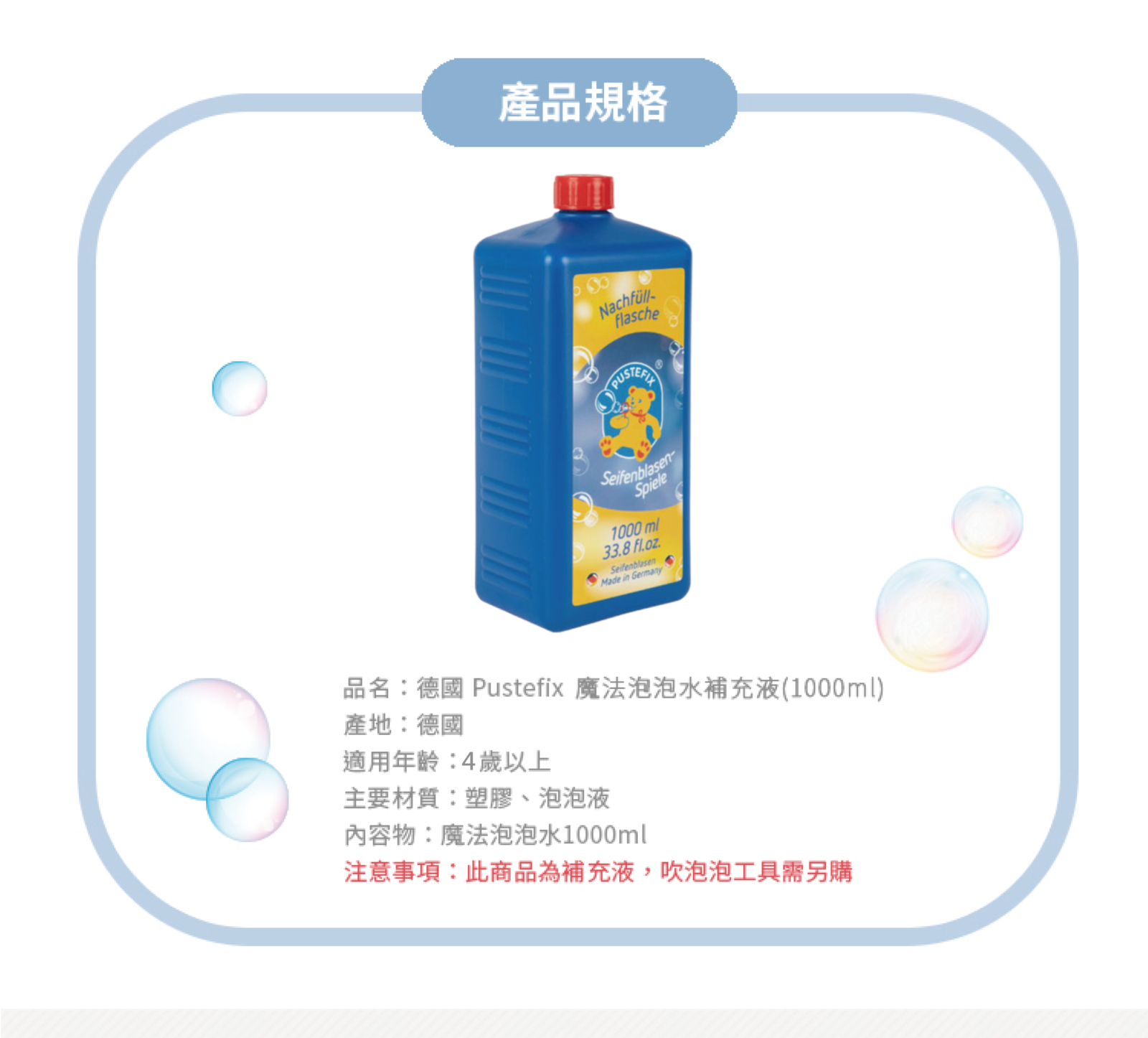 德國原裝進口 七十年大廠 特殊配方 泡泡色彩繽紛不易破 通過台灣ST安全玩具認證 通過國際檢驗無毒 符合EN-71標準 德國原廠授權代理商(非市面上水貨) 適用年齡 4+ ※此賣場為泡泡補充液,不含任何工具※
