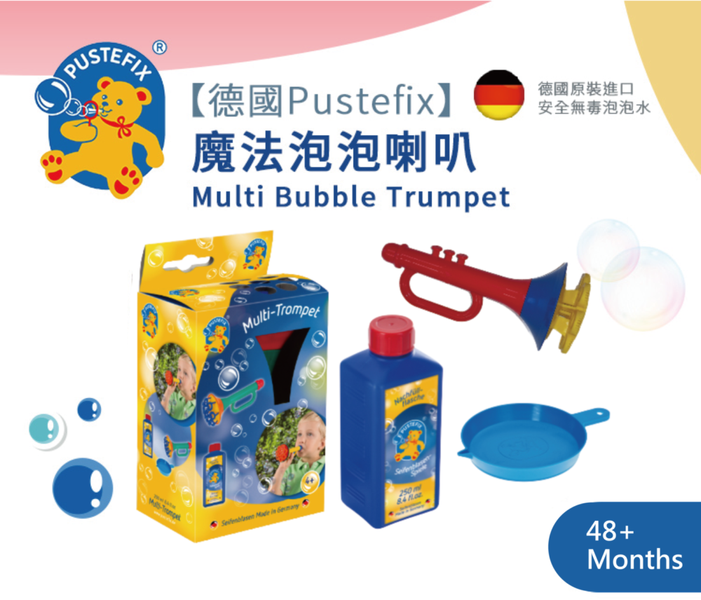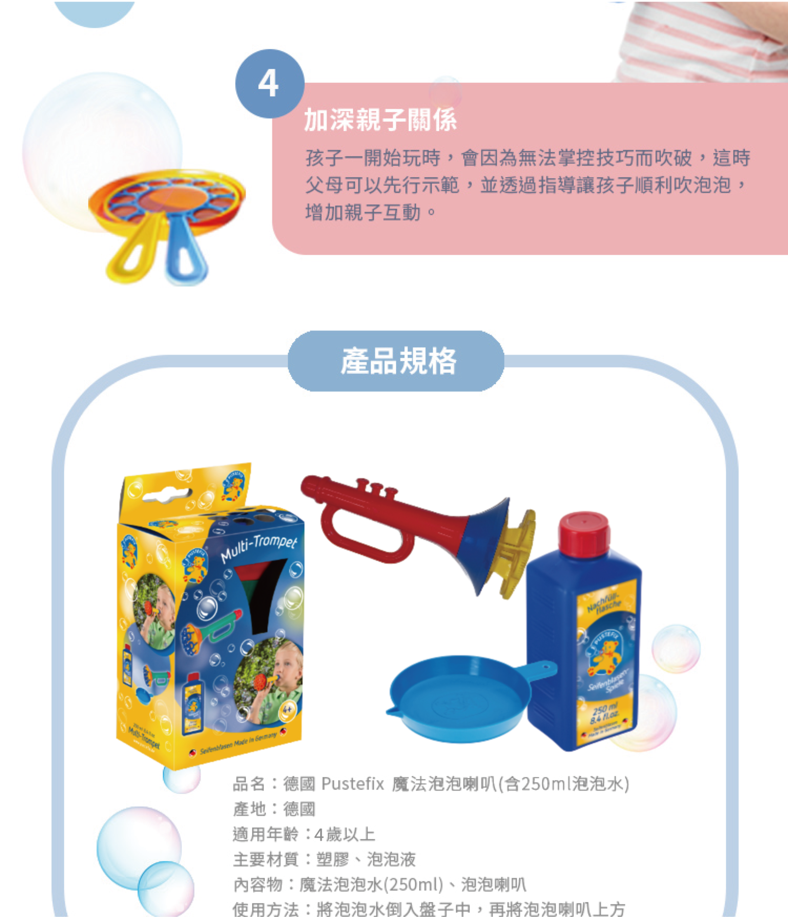 德國原裝進口 七十年大廠 特殊配方 泡泡色彩繽紛不易破 通過食品檢驗無毒 符合EN-71標準 多種造型設計 豐富孩子吹泡泡的時光 德國原廠授權代理商(非市面上水貨) 適用年齡 4+