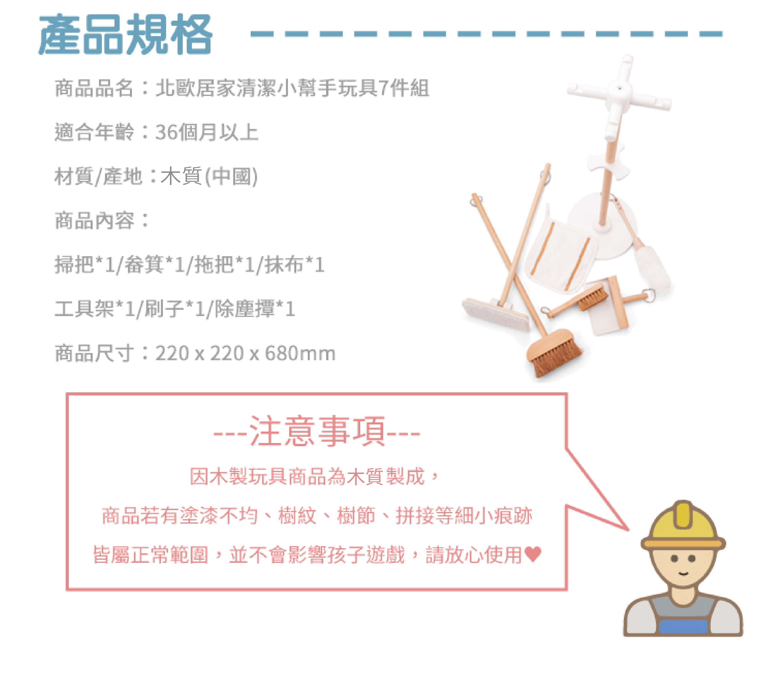 這時,就出現了一位可愛的小木製打掃玩具,它有著質感木製的手柄和典雅的色系毛刷,