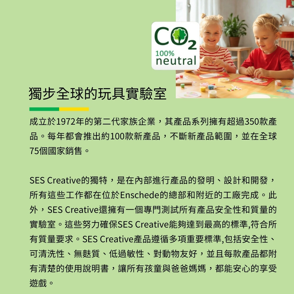 100%荷蘭設計製造 原裝進口 所有產品符合歐盟玩具安全指令(EN-71) 天然無毒,低過敏源且無麩質 SES Creative的核心價值觀是:樂趣、安全和發展。