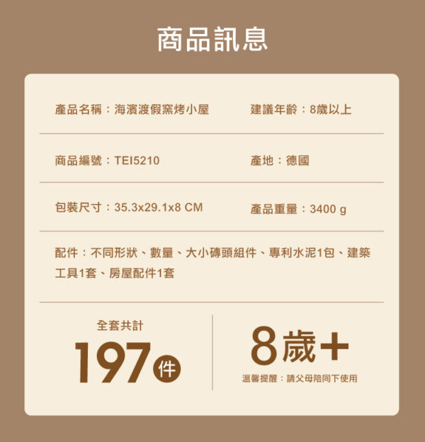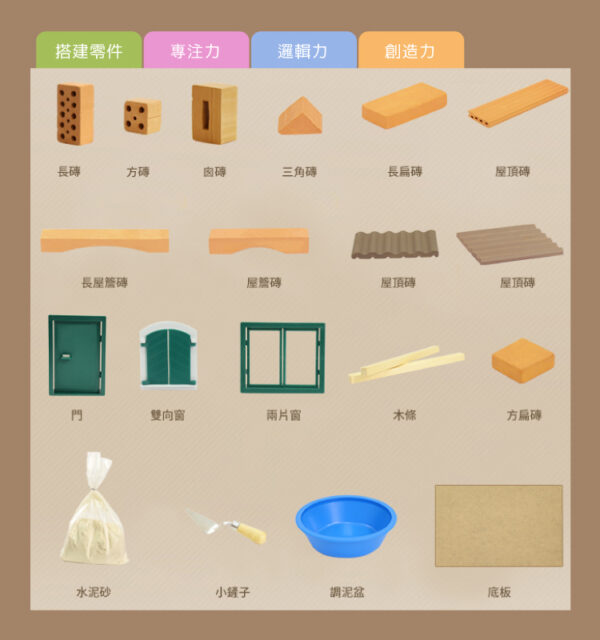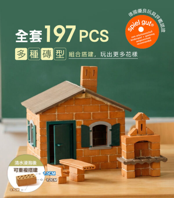 適合年齡:4-6+ 當個小小建築師 激發培養兒童創造力與專注能力 真實黏土燒制而成的真實迷你磚 德國專利環保無毒水泥 可完全溶解 放入水中可溶解水泥 可重覆組裝 德國學校核准的最佳組裝玩具教材 通過世界多國安全玩具檢測認證 德國原裝進口 台灣總代理公司貨