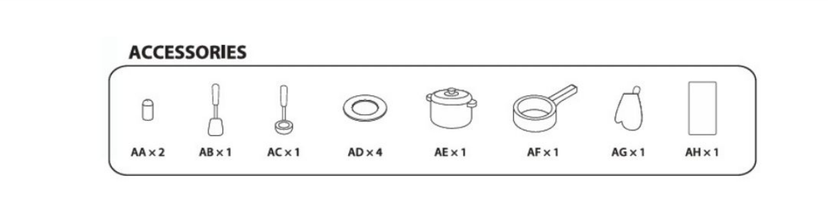 | 內容物 | 盤子*4、湯鍋*1、平底鍋*1、烹飪勺*2、隔熱手套*1、擦手巾*1、調味罐*2 |