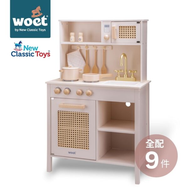 | 商品內容 | woet陽光小主廚(原New Classic Toys)-11045 (粉色 藤編) x1、3件廚具組、食物調味罐x2、隔熱手套x1、小湯鍋x1(含鍋蓋)、平底鍋x1 、塑料製水槽盆x1 (內容物無附食材配件,可另外購買) |