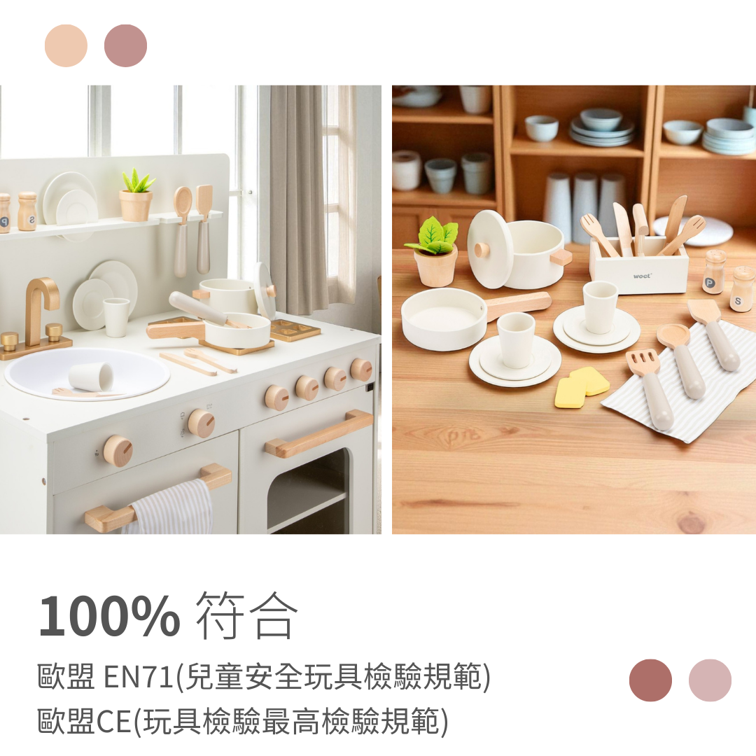 升級木質質感旋鈕可「咔噠咔噠」旋轉操作,擬真廚具觸感更好玩。側邊新增木質掛欄+餐具鉤環,讓收納與裝飾兼具,玩具也能成為家中溫馨風景。